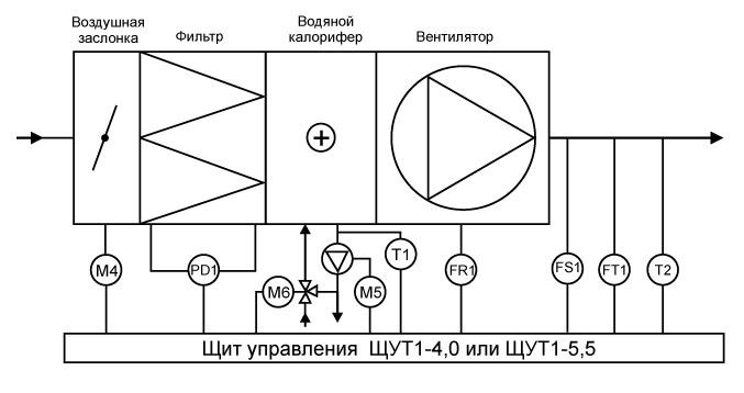 Стандартный щит управления приточной вентиляционной системы с водяным калорифером.
