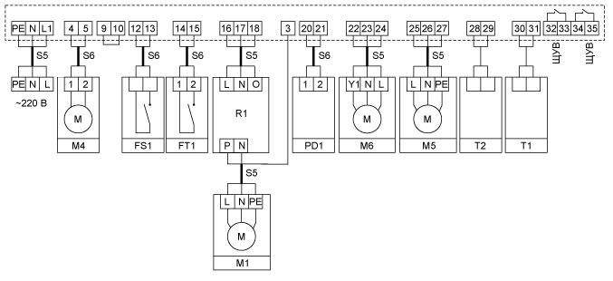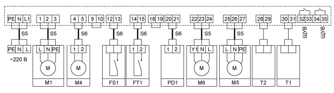 М4 - электропривод воздушной заслонки на 220 В с возвратной пружиной; М5 - циркуляционный насос на 220 В / 6 A;